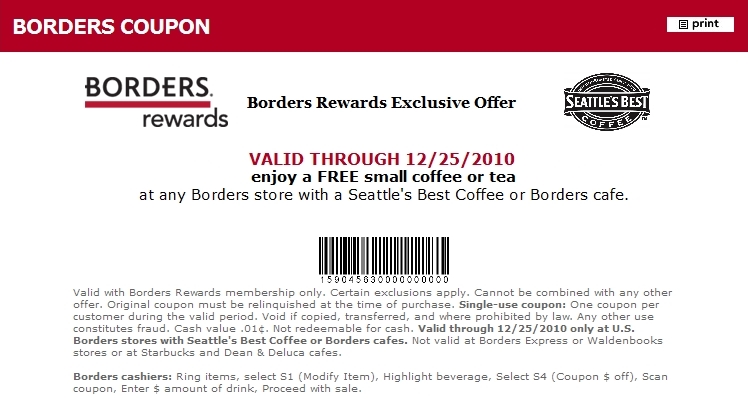Seattle’s Best Cafe inside Borders is offering Borders Rewards members a FREE small coffee or tea with this printable coupon for a limited time. Borders Rewards membership is Free to join. Coupon expires December 25, 2010. [Store Locator]