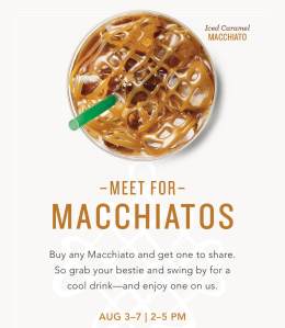 From 2 pm to 5 pm local time, Starbucks will be offering to buy one Starbucks Macchiato and get a second Macchiato for FREE as part of their extended International Friendship Day celebration. Deal ends August 7, 2017. [Starbucks locator]