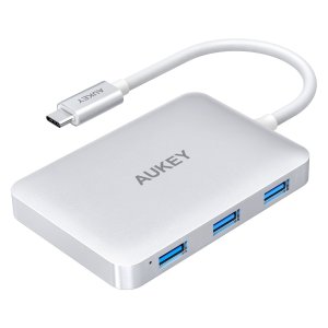 This Aukey USB C hub turns a single USB-C port into six ports for data transfer, display expansion, and charging. It supports a 4K Ultra HD Video output via HDMI at 30Hz, USB Type-C Power Delivery, and four USB 3.1 Gen 1 (USB 3.0) ports support data transfer rates up to 5Gbps.