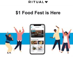 Starting today, August 12, 2019, Ritual is offering lunches at some of your favorite local restaurants for only $1 as part of their $1 Food Festival for a limited time. There’s a maximum of 5 redemptions during this period and limited to one per day. Eligible cities include New York City, Washington D.C., Boston, Philadelphia, Atlanta, Cincinnati, Detroit, Chicago, Minneapolis, Houston, Dallas, Denver, Seattle, San Francisco, Los Angeles and Toronto, Ottawa, Vancouver in Canada.