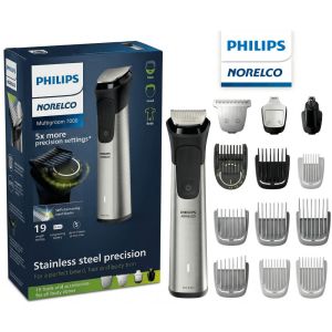 The Philips Norelco Multigroom 7000 is the all-in-one trimmer for ultimate precision with our most advanced baldes. Enjoy best-in-class styling with our most advanced trimmer. DualCut blades deliver maximum precision for head-to-toe styling and even cuts hair. The steel frame and rubber grips deliver superior control and the Lithium-ion battery yields 5 hours of runtime. All-in-one trimmer for face, head and body styling: 19 pieces for all your trimming needs. Maximum precision with DualCut technology includes 2x more self sharpening blades that remain after 3 years of use. Powerful Lithium-ion rechargeable battery delivers up to 5 hours of runtime per charge. To deliver maximum torque and power, the trimmer includes a full-metal motor and a drive train that’s been reinforced with tempered steel. Our unique cutting guards are reinforced with ultra-strong fiberglass material to prevent bending and buckling, ensuring an even trim every time. Philips Norelco products have adaptors with automatic voltage selection with 100 to 240 volts printed on the adaptor to select. For international travel, you may need to use another adaptor or plug, depending on the countries power system and outlets. Includes 1 metal trimmer, 1 foil shaver, 1 detail metal trimmer, 1 nose and ear trimmer, 1 extra-wide hair trimmer, 6 hair trimming guards, 3 beard trimming guards, 2 stubble trimming guards, 2 body trimming guards, an eyebrow trimming guard, an adjustable travel guard, a storage bag and a cleaning brush.