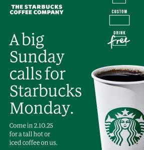On Monday, February 10, 2025, Starbucks will be offering its Rewards members a post-game day coffee for FREE for a limited time. Choose from a tall (12 fl. oz.) hot or iced brewed coffee. If you’re a Starbucks Rewards member, you can apply the coupon in the Starbucks app to your order when using the order ahead feature in the app, or let your barista know you’re redeeming your Starbucks Monday coupon when ordering in the store or in the drive-thru.