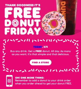 Starting today and every Friday in March, Dunkin’ is offering it’s DD Perks members a FREE Donut with every Drink Purchase for a limited time. You can order ahead in the app by adding a donut to your drink purchase and it will be discount at checkout or scan your card for in-store purchases. If you are not a DD Perks member, it’s Free to join. DD Perks is Dunkin’s Loyalty program, very similar to Starbuck’s Rewards, you earn 5 points for every dollar you spend and 200 points gets Free beverage of any size.